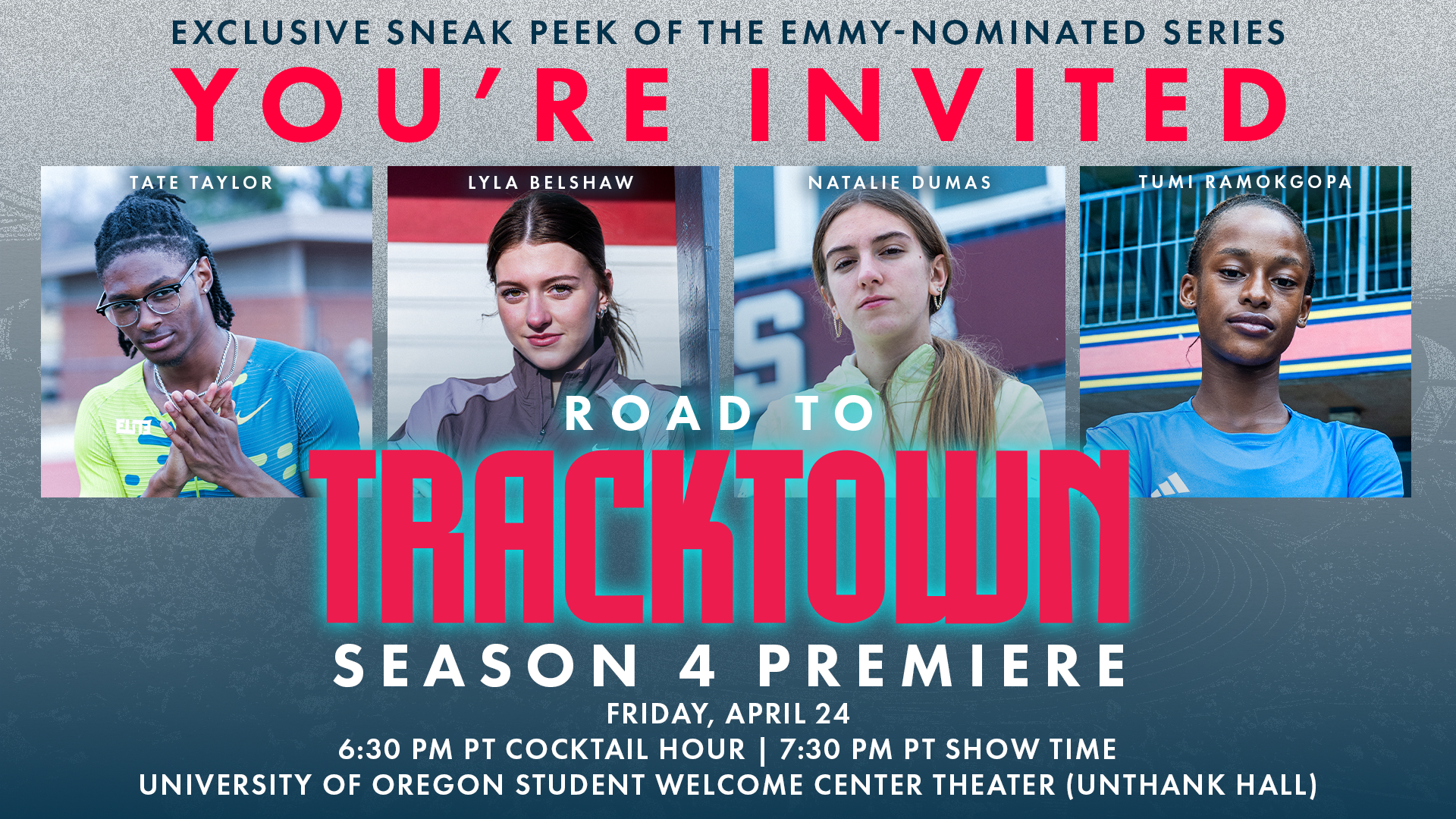 Join us for an evening featuring an exclusive sneak peek at “Road to TrackTown” Season 4 — TrackTown USA’s digital-first docuseries that follows four of track & field’s rising stars through the 2026 World Athletics U20 Championships, to be contested here at Hayward Field at the University of Oregon from August 5-9.